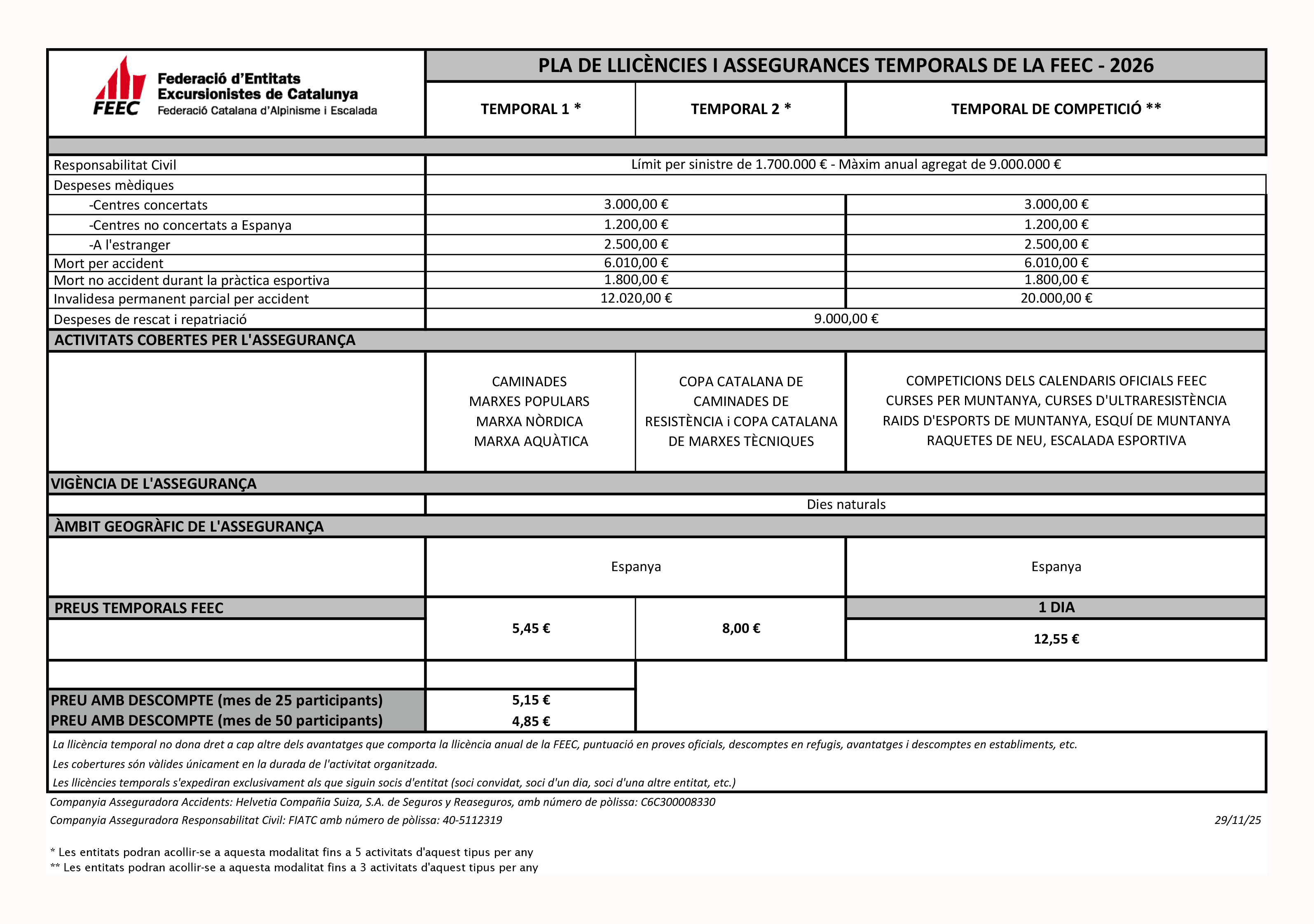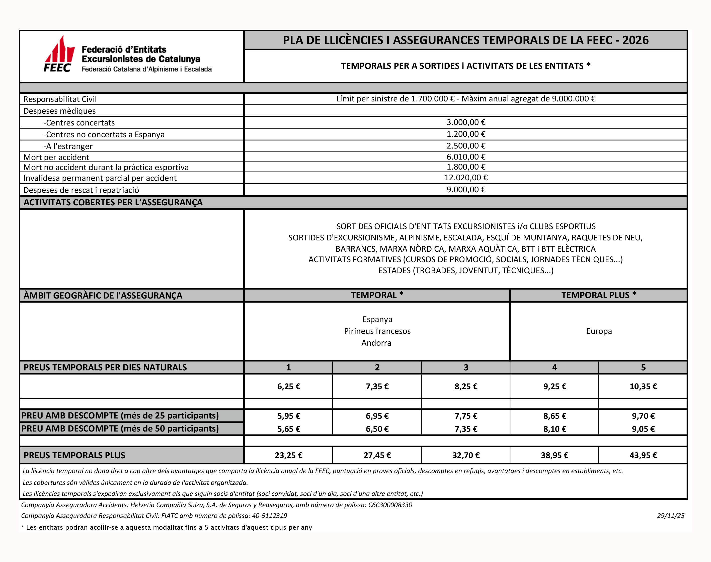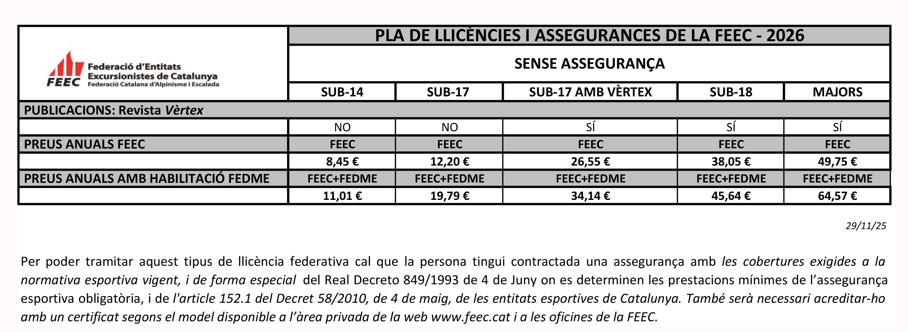 Els socis de l'entitat poden fer l'encàrrec de la llicència de la FEEC sens haver-se de desplaçar expressament a l'estatge social. Per encarregar la vostra llicència heu de procedir de la forma següent: 1) Consulteu les diferents modalitats de llicències que ofereix la FEEC 2) Un cop triada la versió que es desitja heu de fer una transferència al comte ES97 3140 0001 9800 1707 2600 (Caixa de Guissona) 3) Amb l'import que transferiu a Secretaria ja sabran quina versió de llicència s'ha triat 4) És imprescindible que a la transferència hi feu constar el vostre nom i cognoms Passats 5 dies podeu trucar a Secretaria, tel. 623 422 942 Sra. Montserrat, els dilluns, dimecres i divendres de les 18:30 a les 20:30 per consultar quan podeu passar a recollir la llicència demanada. Si voleu que us fem arribar el carnet federatiu al vostre domicili o preferiu que el reculli una altra persona, heu de trucar (els dies i horaris establerts) o enviar un correu electrònic a Secretaria en el qual heu de fer constar el vostre nom i l'adreça on s'ha d'enviar el carnet, en el cas de voler-lo rebre a domicili o el nom concret de la persona que el recollirà. 2026