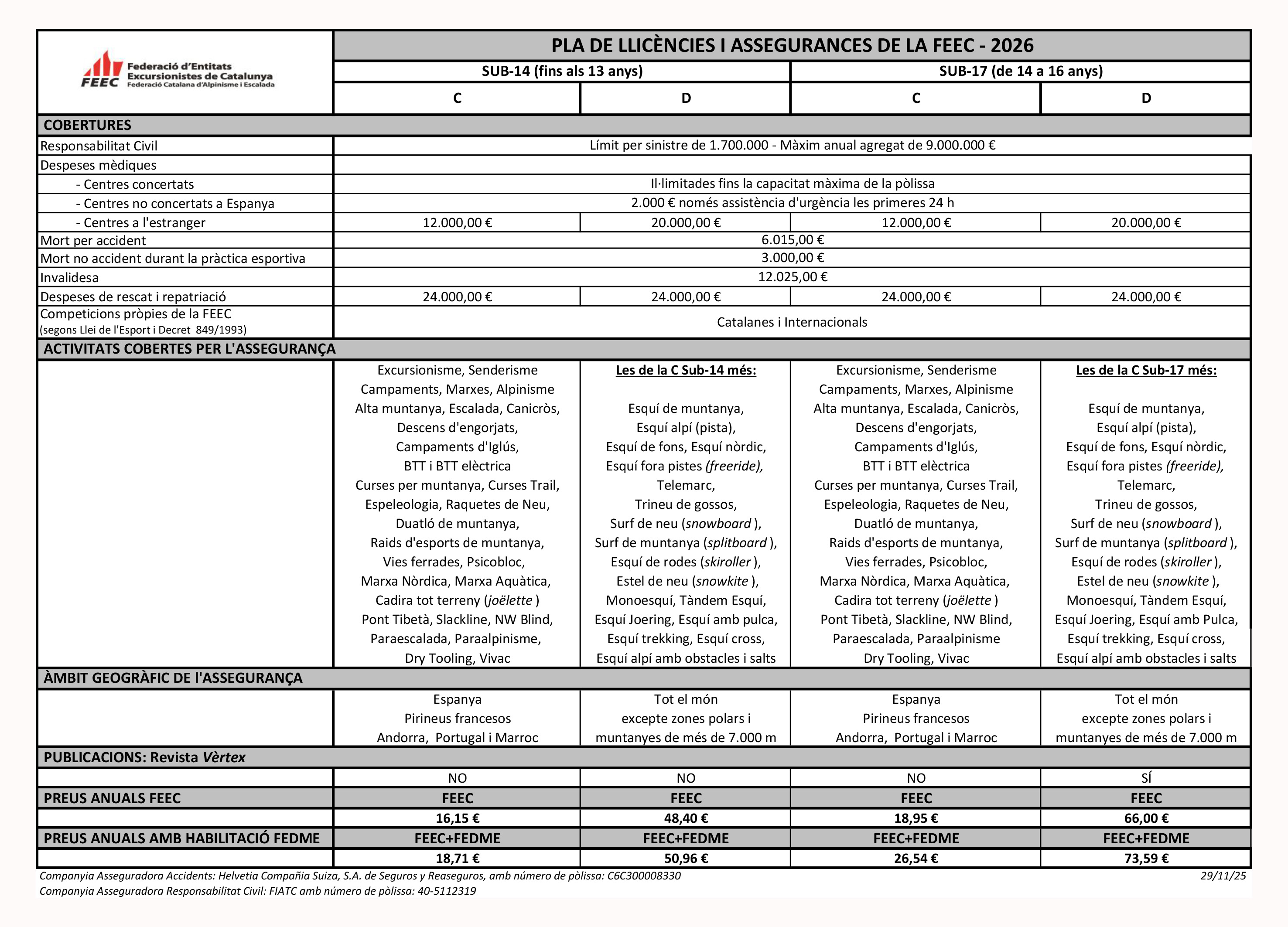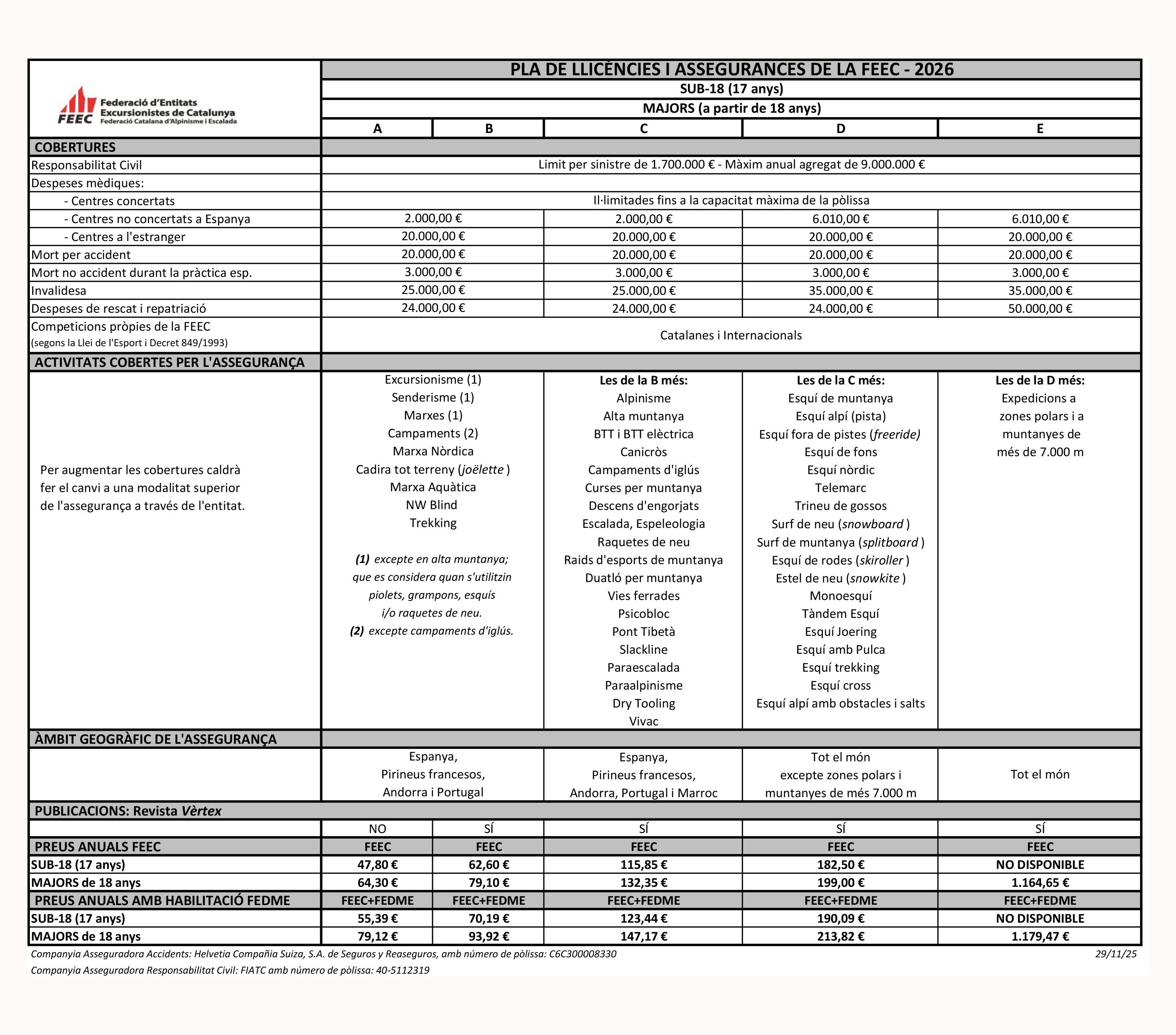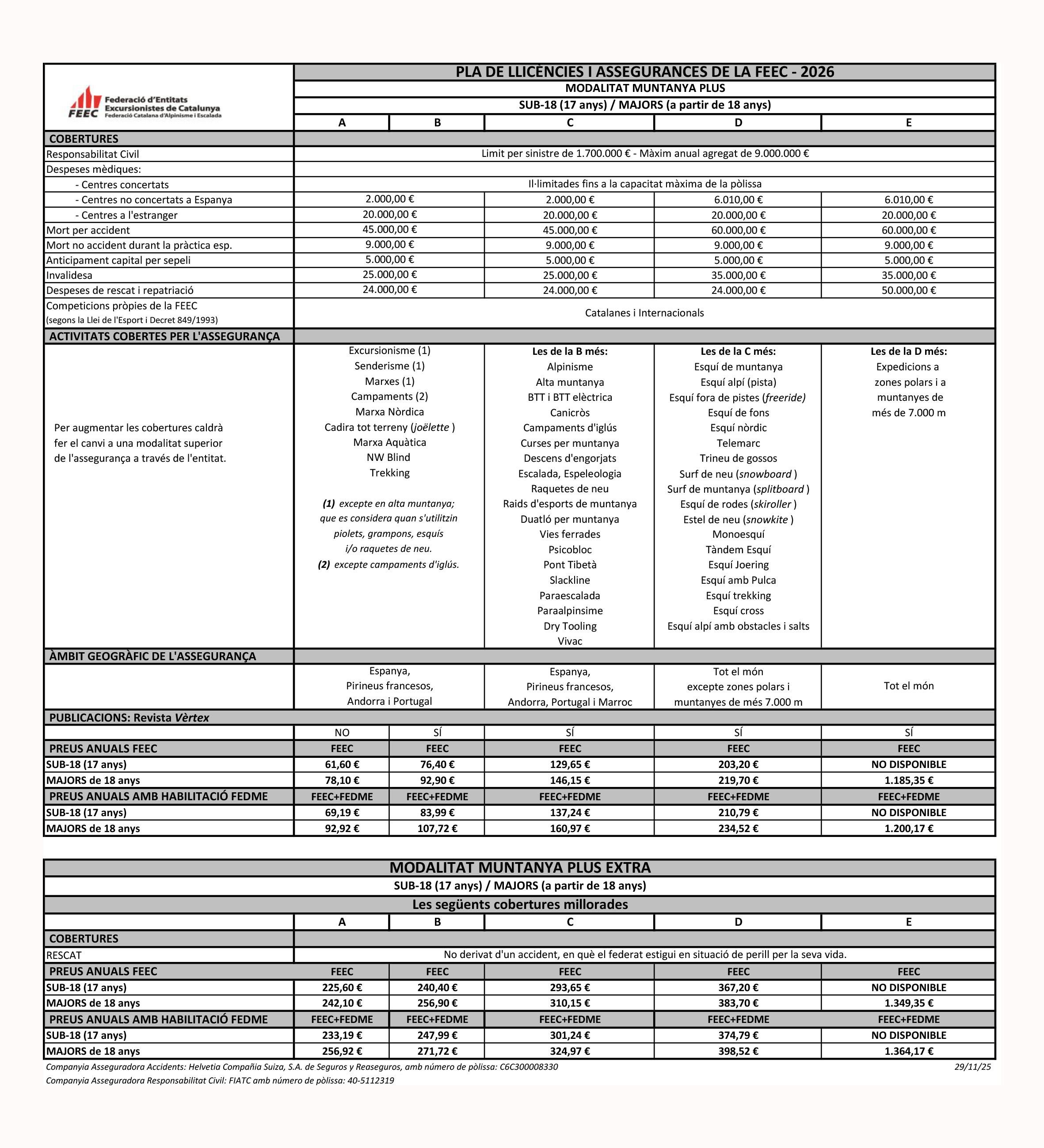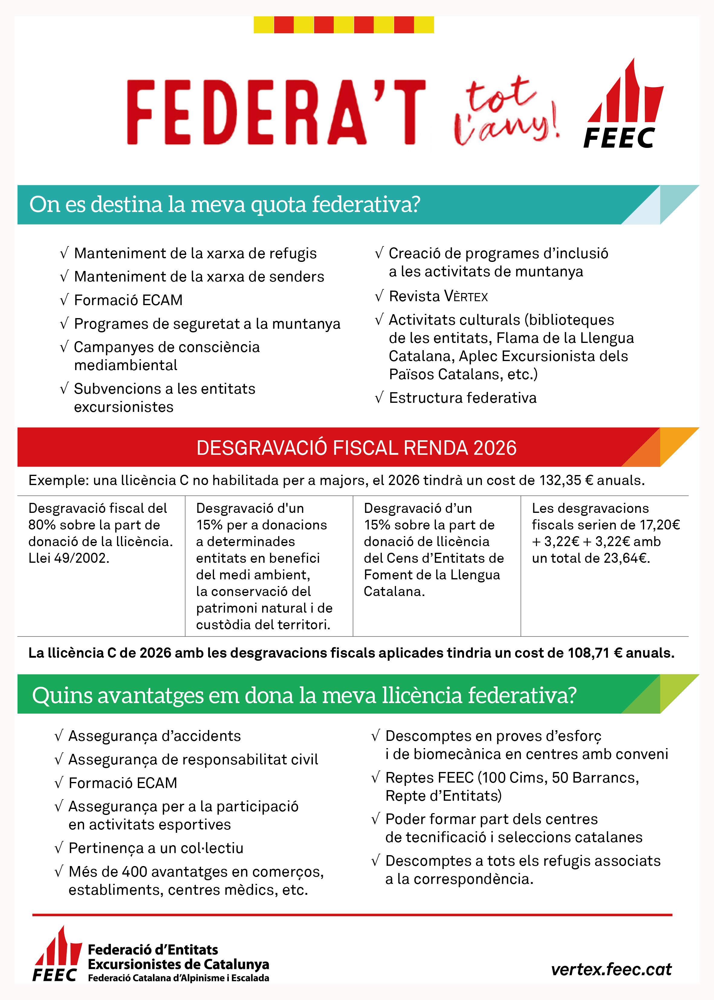 Els socis de l'entitat poden fer l'encàrrec de la llicència de la FEEC sens haver-se de desplaçar expressament a l'estatge social. Per encarregar la vostra llicència heu de procedir de la forma següent: 1) Consulteu les diferents modalitats de llicències que ofereix la FEEC 2) Un cop triada la versió que es desitja heu de fer una transferència al comte ES97 3140 0001 9800 1707 2600 (Caixa de Guissona) 3) Amb l'import que transferiu a Secretaria ja sabran quina versió de llicència s'ha triat 4) És imprescindible que a la transferència hi feu constar el vostre nom i cognoms Passats 5 dies podeu trucar a Secretaria, tel. 623 422 942 Sra. Montserrat, els dilluns, dimecres i divendres de les 18:30 a les 20:30 per consultar quan podeu passar a recollir la llicència demanada. Si voleu que us fem arribar el carnet federatiu al vostre domicili o preferiu que el reculli una altra persona, heu de trucar (els dies i horaris establerts) o enviar un correu electrònic a Secretaria en el qual heu de fer constar el vostre nom i l'adreça on s'ha d'enviar el carnet, en el cas de voler-lo rebre a domicili o el nom concret de la persona que el recollirà. 2026