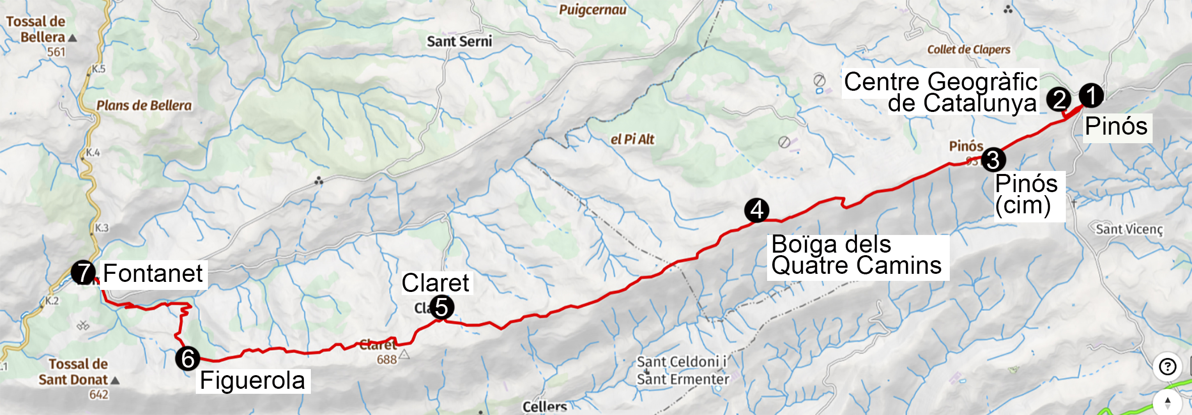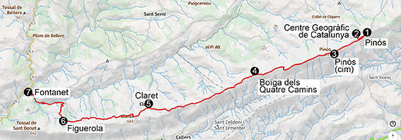 Itinerari: Pinós (1), Centre Geogràfic de Catalunya (2), cim de Pinós (3), Boïga dels Quatre Camins (4), Claret (5), Figuerola (6) i Fontanet (7).