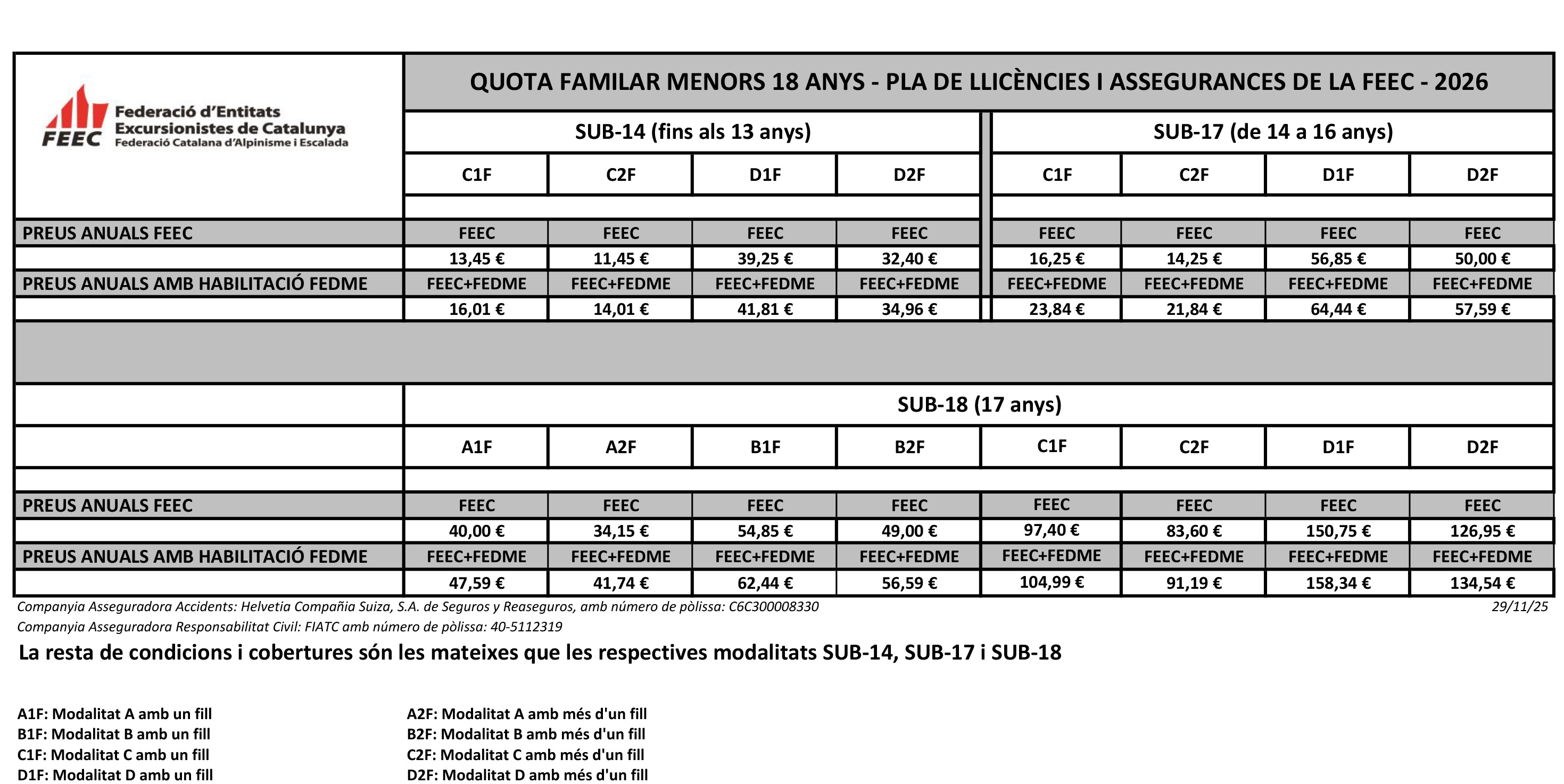 Els socis de l'entitat poden fer l'encàrrec de la llicència de la FEEC sens haver-se de desplaçar expressament a l'estatge social. Per encarregar la vostra llicència heu de procedir de la forma següent: 1) Consulteu les diferents modalitats de llicències que ofereix la FEEC 2) Un cop triada la versió que es desitja heu de fer una transferència al comte ES97 3140 0001 9800 1707 2600 (Caixa de Guissona) 3) Amb l'import que transferiu a Secretaria ja sabran quina versió de llicència s'ha triat 4) És imprescindible que a la transferència hi feu constar el vostre nom i cognoms Passats 5 dies podeu trucar a Secretaria, tel. 623 422 942 Sra. Montserrat, els dilluns, dimecres i divendres de les 18:30 a les 20:30 per consultar quan podeu passar a recollir la llicència demanada. Si voleu que us fem arribar el carnet federatiu al vostre domicili o preferiu que el reculli una altra persona, heu de trucar (els dies i horaris establerts) o enviar un correu electrònic a Secretaria en el qual heu de fer constar el vostre nom i l'adreça on s'ha d'enviar el carnet, en el cas de voler-lo rebre a domicili o el nom concret de la persona que el recollirà. 2026